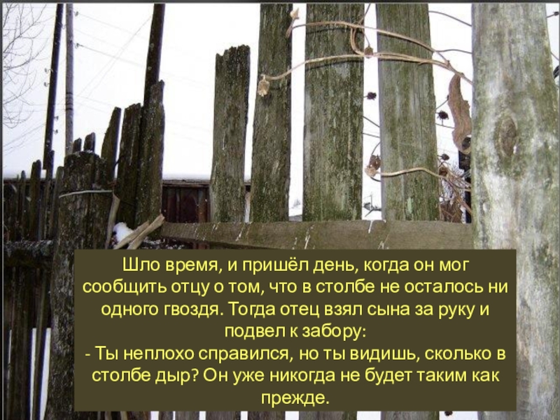 том, что в столбе не осталось ни одного гвоздя. Тогда отец взял сына за руку и подвел к забору: