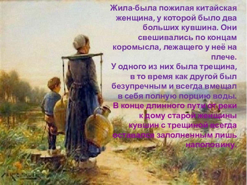 Слайд 14Жила-была пожилая китайская женщина, у которой было два больших кувшина. Они
