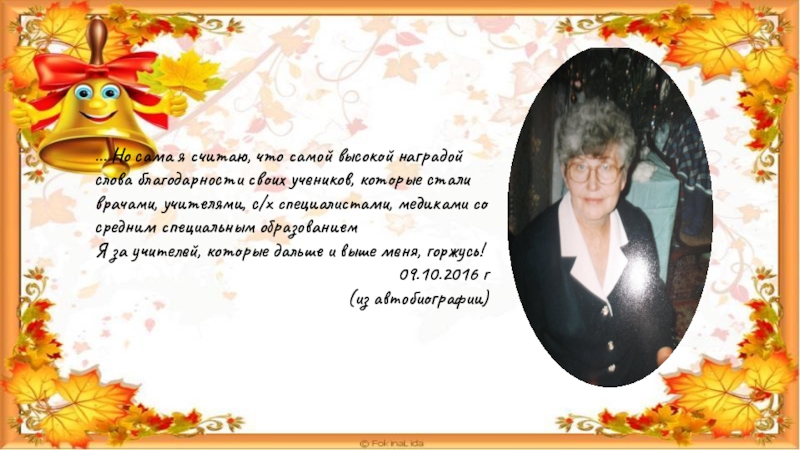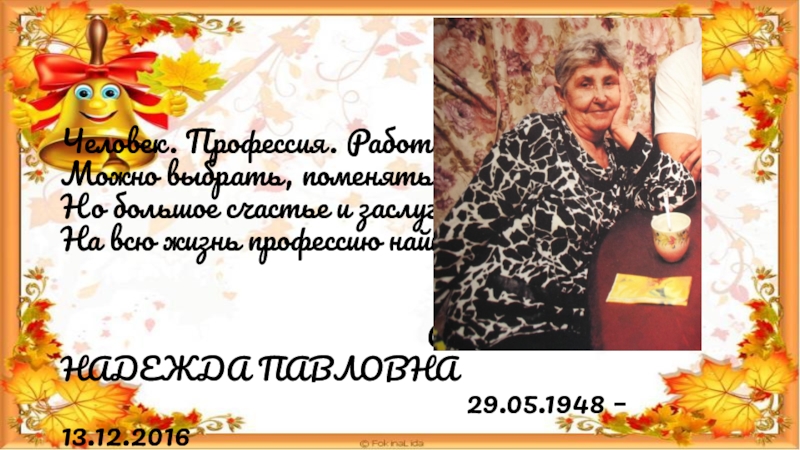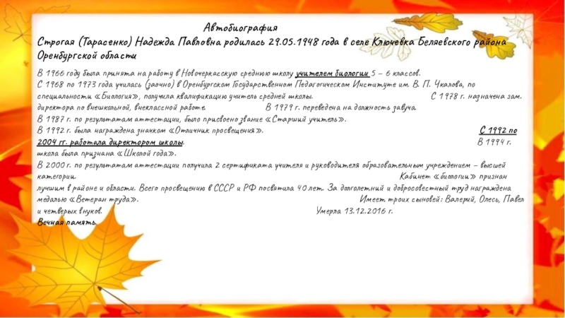 В 1966 году была принята на работу в Новочеркасскую среднюю школу учителем биологии 5 – 6 классов. С 1968 по 1973 года училась (заочно) в Оренбургском Государственном Педагогическом Институте им. В. П. Чкалова, по специальности «Биология», получила квалификацию учитель средней школы. С 1978 г. назначена зам. директора по внешкольной, внеклассной работе. В 1979 г. переведена на должность завуча. В 1987 г. по результатам аттестации, было присвоено звание «Старший учитель». В 1992 г. была награждена значком «Отличник просвещения». С 1992 по 2004 гг. работала директором школы. В 1994 г. школа была признана «Школой года». В 2000 г. по результатам аттестации получила 2 сертификата учителя и руководителя образовательным учреждением – высшей категории. Кабинет «биологии» признан лучшим в районе и области. Всего просвещению в СССР и РФ посвятила 40 лет. За долголетний и добросовестный труд награждена медалью «Ветеран труда». Имеет троих сыновей: Валерий, Олесь, Павел и четверых внуков. Умерла 13.12.2016 г. Вечная память.