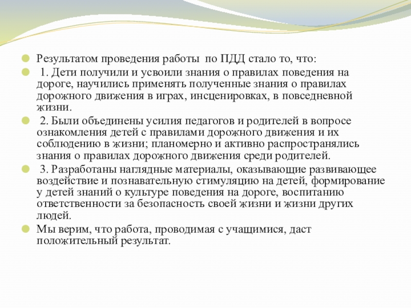 Результатом проведения работы  по ПДД стало то, что: 1. Дети получили и усвоили знания о правилах поведения