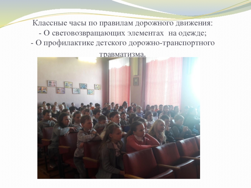 Слайд 13 Классные часы по правилам дорожного движения: - О световозвращающих элементах на одежде; -