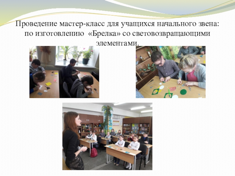 Слайд 10Проведение мастер-класс для учащихся начального звена: по изготовлению «Брелка» со световозвращающими