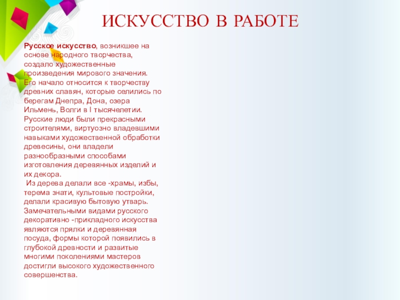 Русское искусство, возникшее на основе народного творчества, создало художественные