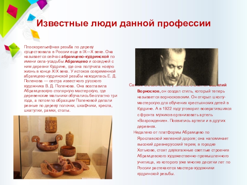 в IX—X веке. Она называется сейчас абрамцево-кудринской по имени села-усадьбы Абрамцево и соседней с ним деревни Кудрине, где она получила новую жизнь в конце XIX века. У истоков современной абрамцево-кудринской резьбы находилась Е. Д. Поленова — сестра известного русского художника В. Д. Поленова. Она возглавила Абрамцевскую столярную мастерскую, где деревенские мальчики обучались бесплатно три года, а потом по образцам Поленовой делали резные по дереву полочки, шкафчики, кресла, шкатулки, рамки, столы.