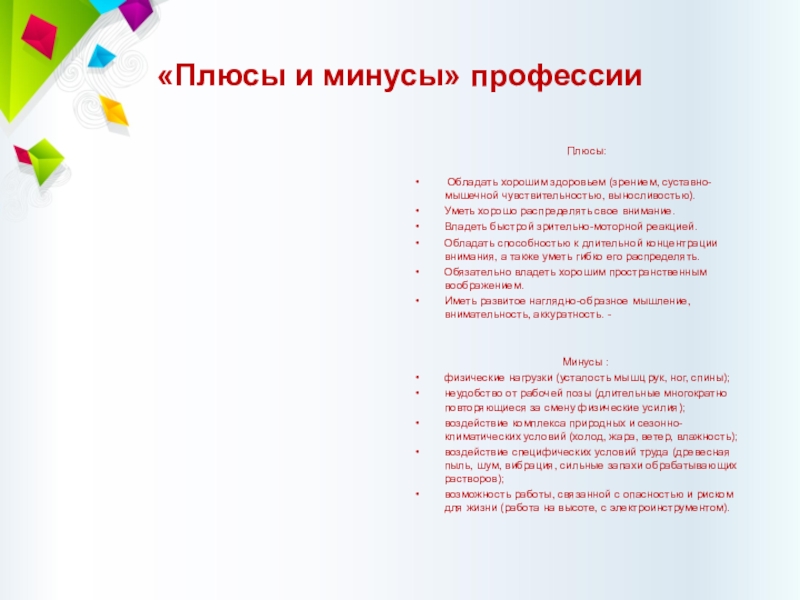 Слайд 13«Плюсы и минусы» профессии