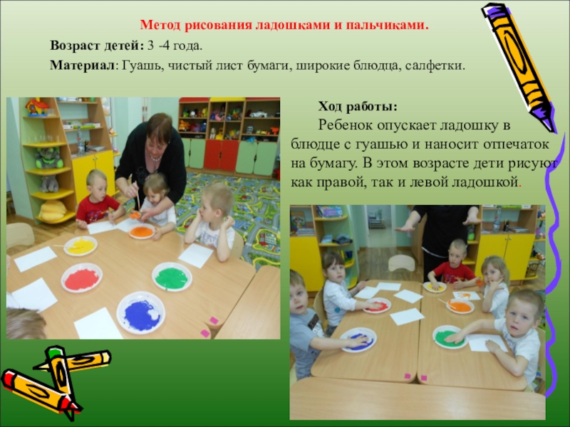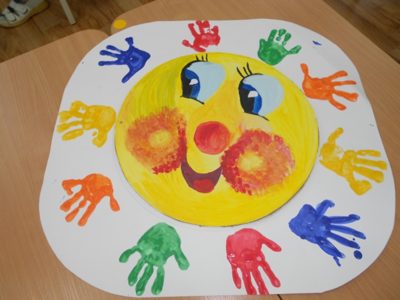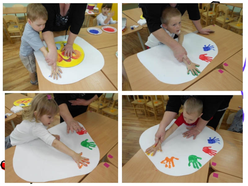 Ребенок опускает ладошку в блюдце с гуашью и наносит отпечаток на бумагу. В этом возрасте дети рисуют как правой, так и левой ладошкой.
