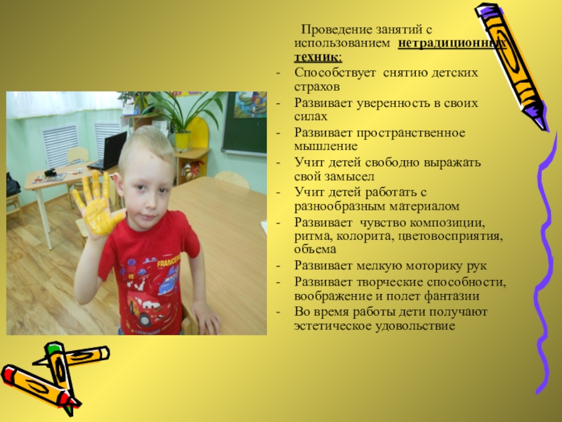 в планировании занятий по изобразительной деятельности соблюдайте систему и преемственность использования нетрадиционных изобразительных техник, учитывая возрастные и индивидуальные способности детей;