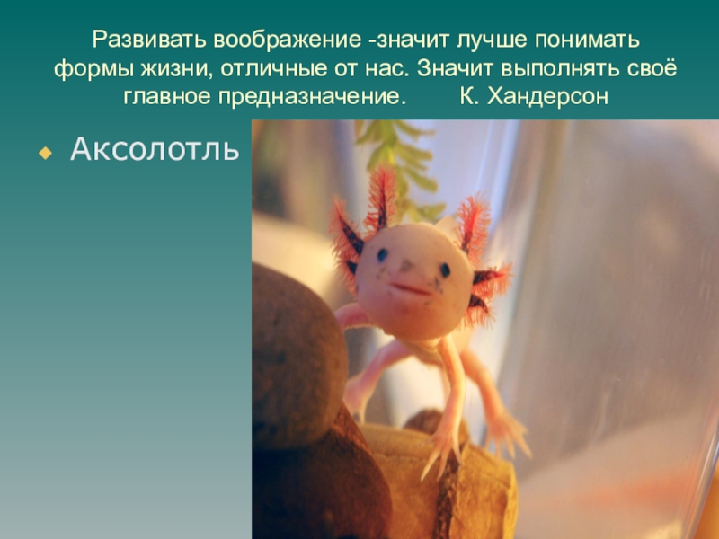 Развивать воображение -значит лучше понимать формы жизни, отличные от нас. Значит выполнять своё главное предназначение. К. ХандерсонАксолотль