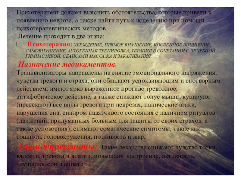 Слайд 8Психотерапевт должен выяснить обстоятельства, которые привели к появлению невроза, а также
