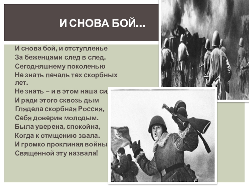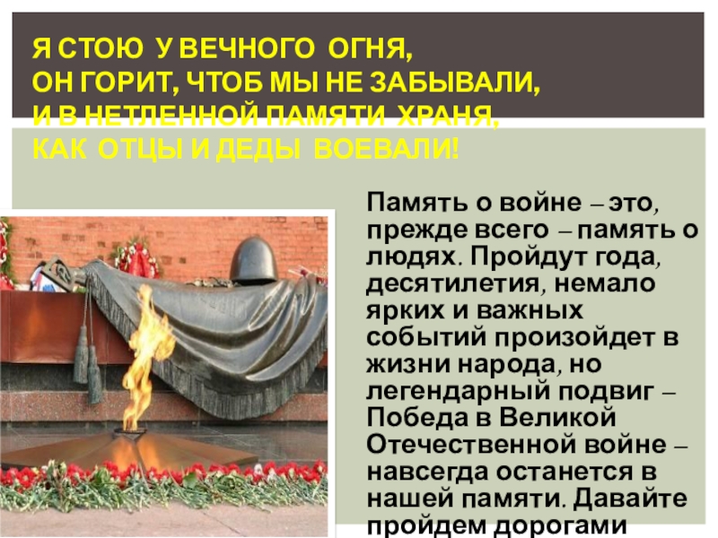 Память о войне – это, прежде всего – память о людях. Пройдут года, десятилетия, немало ярких и важных событий произойдет в жизни народа, но легендарный подвиг – Победа в Великой Отечественной войне – навсегда останется в нашей памяти. Давайте пройдем дорогами войны и вспомним, как это было.