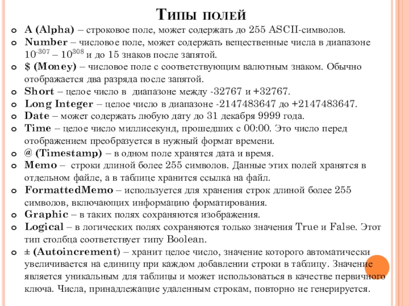 Memo – строки длиной более 255 символов. Данные этих полей хранятся в отдельном файле, а в таблице хранится ссылка на файл.