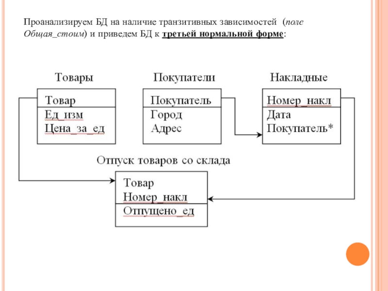 Слайд 6Проанализируем БД на наличие транзитивных зависимостей (поле Общая_стоим) и приведем БД