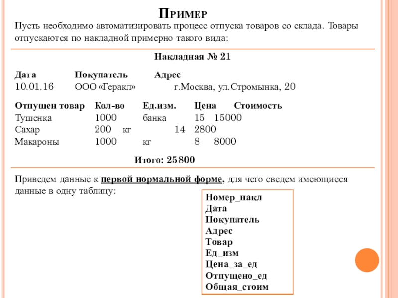Приведем данные к первой нормальной форме, для чего сведем имеющиеся данные в одну таблицу: