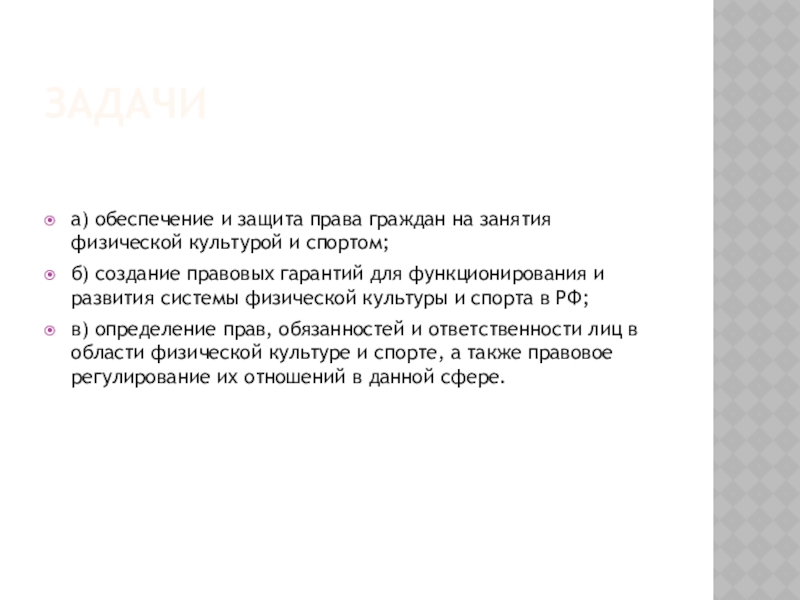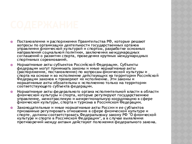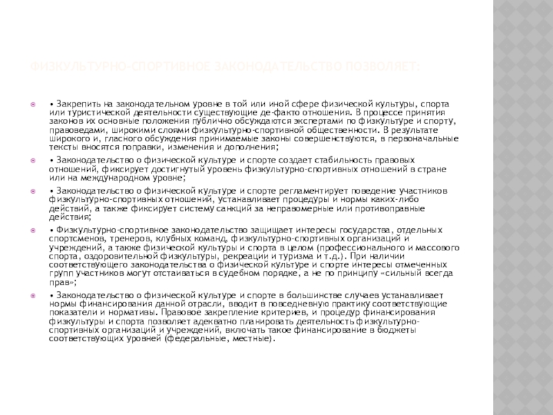 • Законодательство о физической культуре и спорте создает стабильность правовых отношений, фиксирует достигнутый уровень физкультурно-спортивных отношений в стране или на международном уровне;