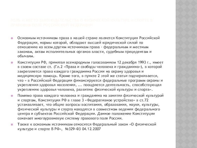 положения Конституции РФ, нормативные акты, принимаемые Российской Федерацией и ее субъектами в области физической культуры и спорта.