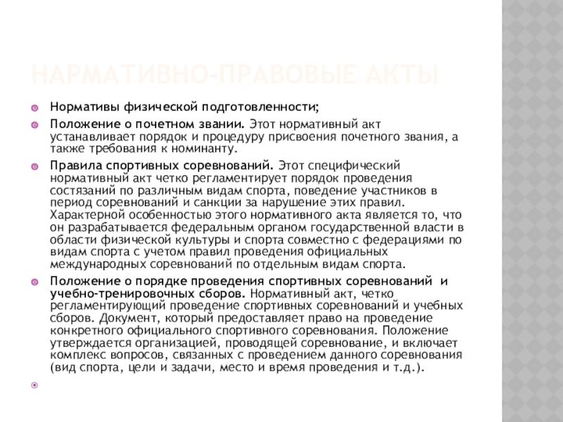 Правила спортивных соревнований. Этот специфический нормативный акт четко регламентирует порядок проведения состязаний по различным видам спорта, поведение участников в период соревнований и санкции за нарушение этих правил. Характерной особенностью этого нормативного акта является то, что он разрабатывается федеральным органом государственной власти в области физической культуры и спорта совместно с федерациями по видам спорта с учетом правил проведения официальных международных соревнований по отдельным видам спорта.