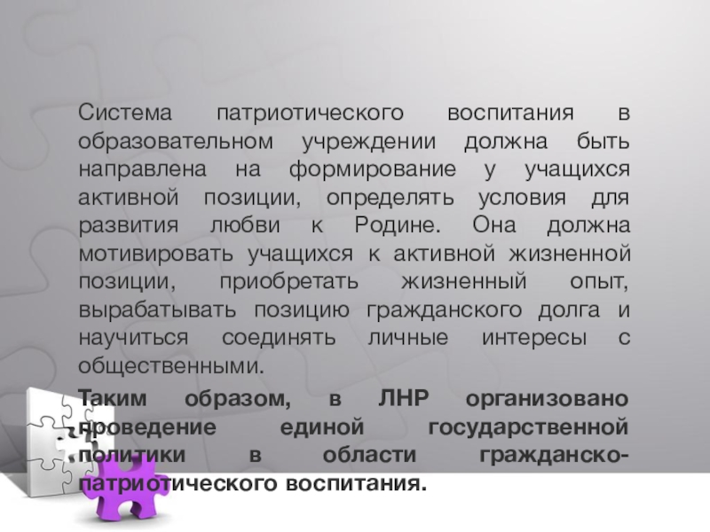 Таким образом, в ЛНР организовано проведение единой государственной политики в области гражданско-патриотического воспитания.