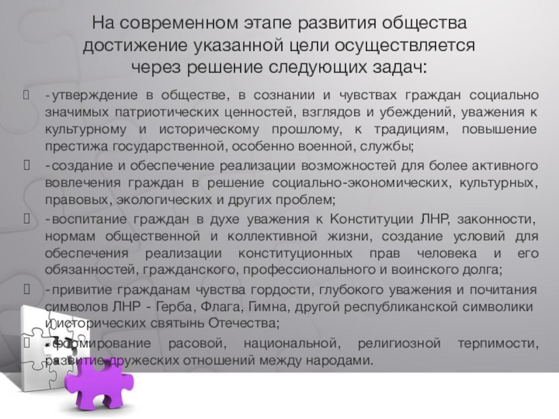 - воспитание граждан в духе уважения к Конституции ЛНР, законности, нормам общественной и коллективной жизни, создание условий для обеспечения реализации конституционных прав человека и его обязанностей, гражданского, профессионального и воинского долга;
