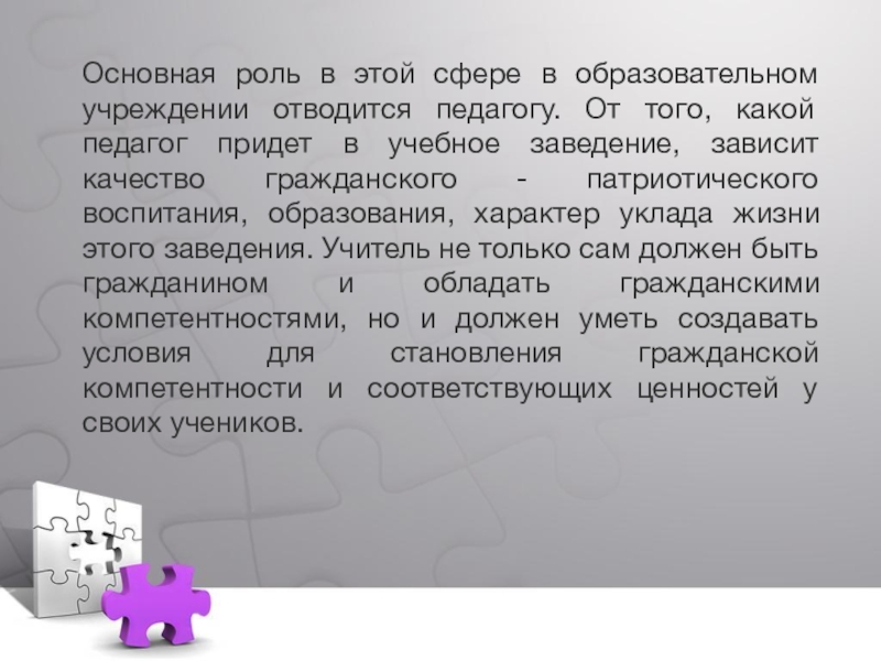 того, какой педагог придет в учебное заведение, зависит качество гражданского - патриотического воспитания, образования, характер уклада жизни этого заведения. Учитель не только сам должен быть гражданином и обладать гражданскими компетентностями, но и должен уметь создавать условия для становления гражданской компетентности и соответствующих ценностей у своих учеников.
