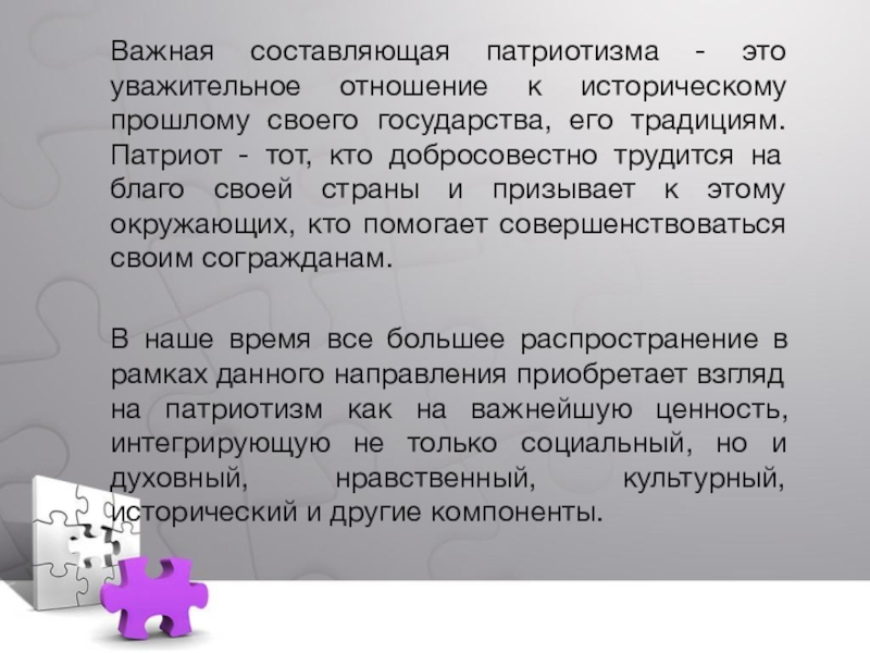 государства, его традициям. Патриот - тот, кто добросовестно трудится на благо своей страны и призывает к этому окружающих, кто помогает совершенствоваться своим согражданам.