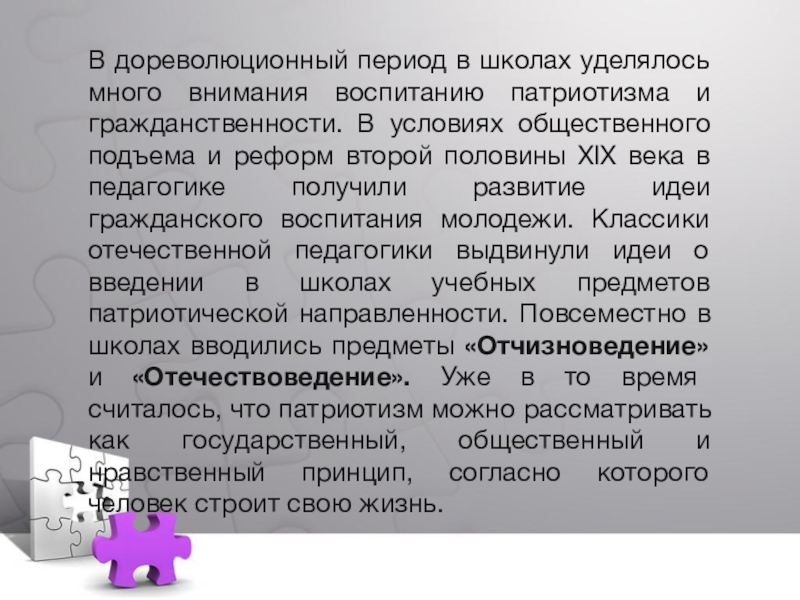гражданственности. В условиях общественного подъема и реформ второй половины ХIХ века в педагогике получили развитие идеи гражданского воспитания молодежи. Классики отечественной педагогики выдвинули идеи о введении в школах учебных предметов патриотической направленности. Повсеместно в школах вводились предметы «Отчизноведение» и «Отечествоведение». Уже в то время считалось, что патриотизм можно рассматривать как государственный, общественный и нравственный принцип, согласно которого человек строит свою жизнь.