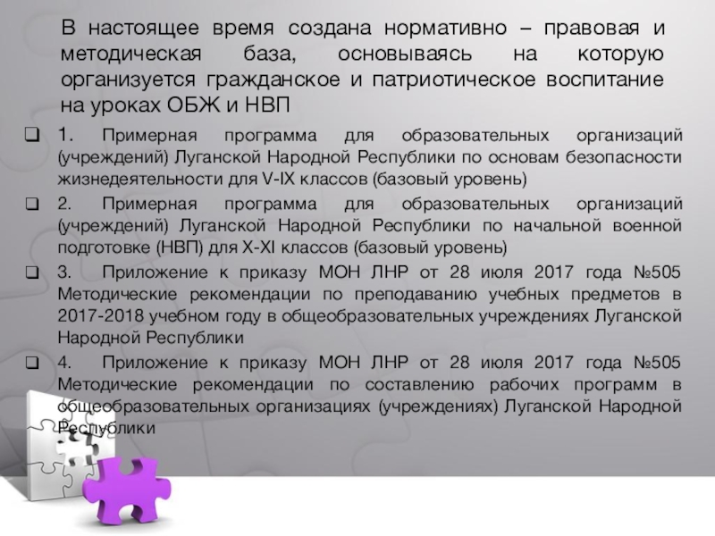 Слайд 8В настоящее время создана нормативно – правовая и методическая база, основываясь