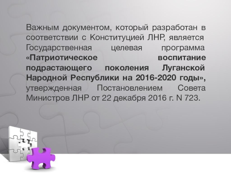 целевая программа «Патриотическое воспитание подрастающего поколения Луганской Народной Республики на 2016-2020 годы», утвержденная Постановлением Совета Министров ЛНР от 22 декабря 2016 г. N 723.