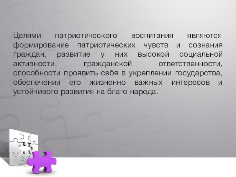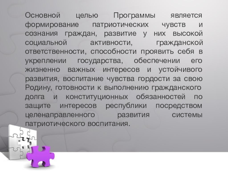 у них высокой социальной активности, гражданской ответственности, способности проявить себя в укреплении государства, обеспечении его жизненно важных интересов и устойчивого развития, воспитание чувства гордости за свою Родину, готовности к выполнению гражданского долга и конституционных обязанностей по защите интересов республики посредством целенаправленного развития системы патриотического воспитания.