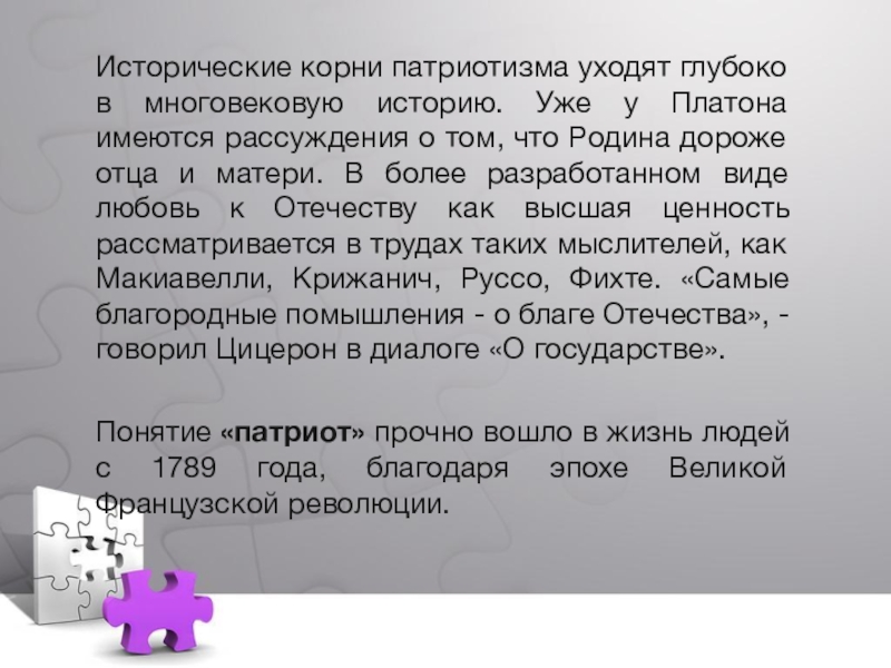 Исторические корни патриотизма уходят глубоко в многовековую историю. Уже у Платона