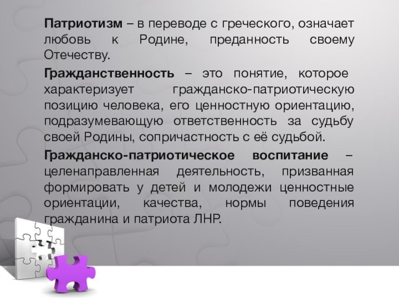 Гражданско-патриотическое воспитание – целенаправленная деятельность, призванная формировать у детей и молодежи ценностные ориентации, качества, нормы поведения гражданина и патриота ЛНР.