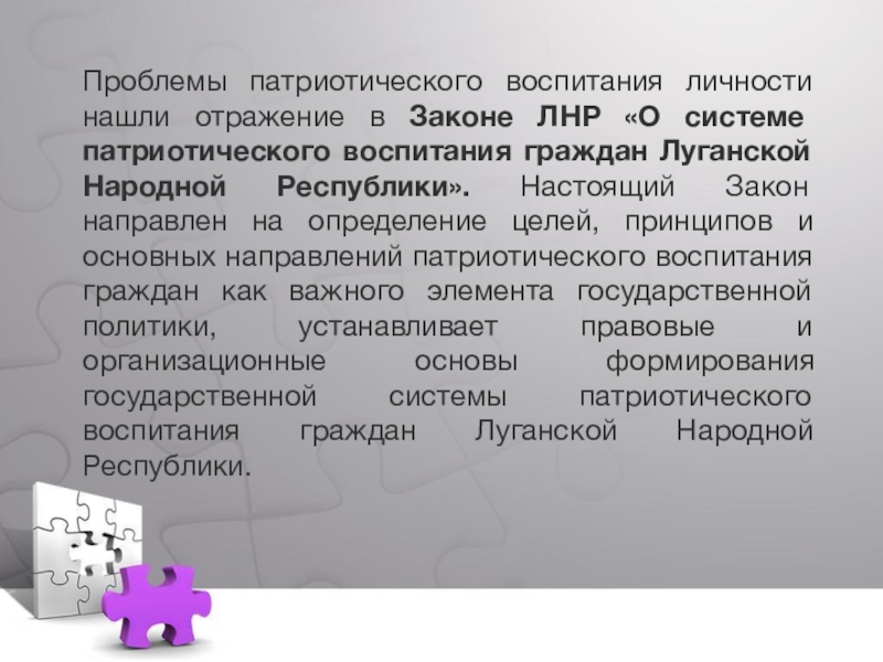патриотического воспитания граждан Луганской Народной Республики». Настоящий Закон направлен на определение целей, принципов и основных направлений патриотического воспитания граждан как важного элемента государственной политики, устанавливает правовые и организационные основы формирования государственной системы патриотического воспитания граждан Луганской Народной Республики.