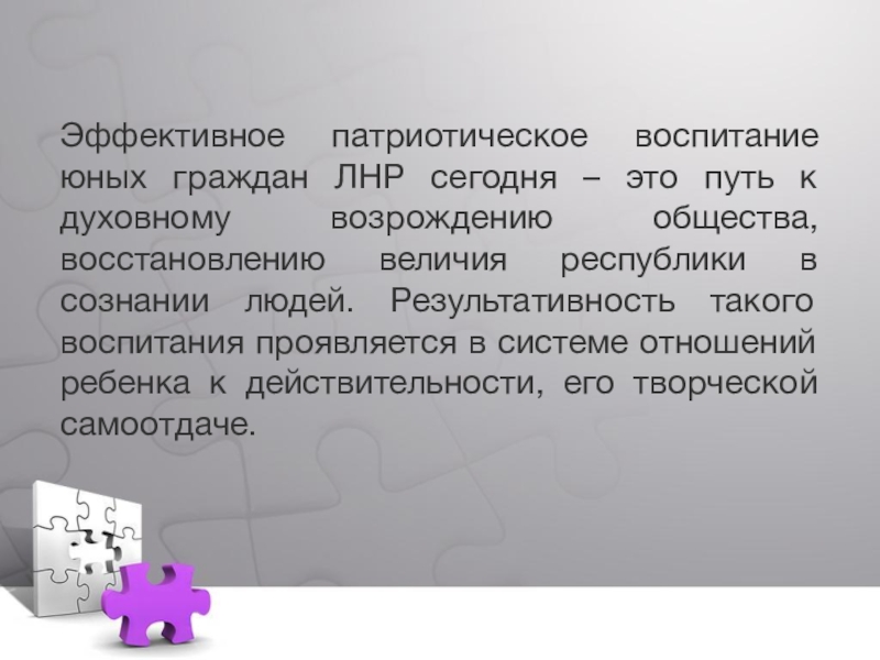 духовному возрождению общества, восстановлению величия республики в сознании людей. Результативность такого воспитания проявляется в системе отношений ребенка к действительности, его творческой самоотдаче.
