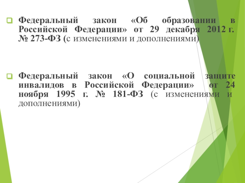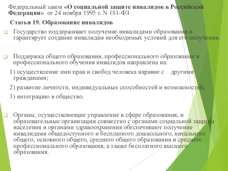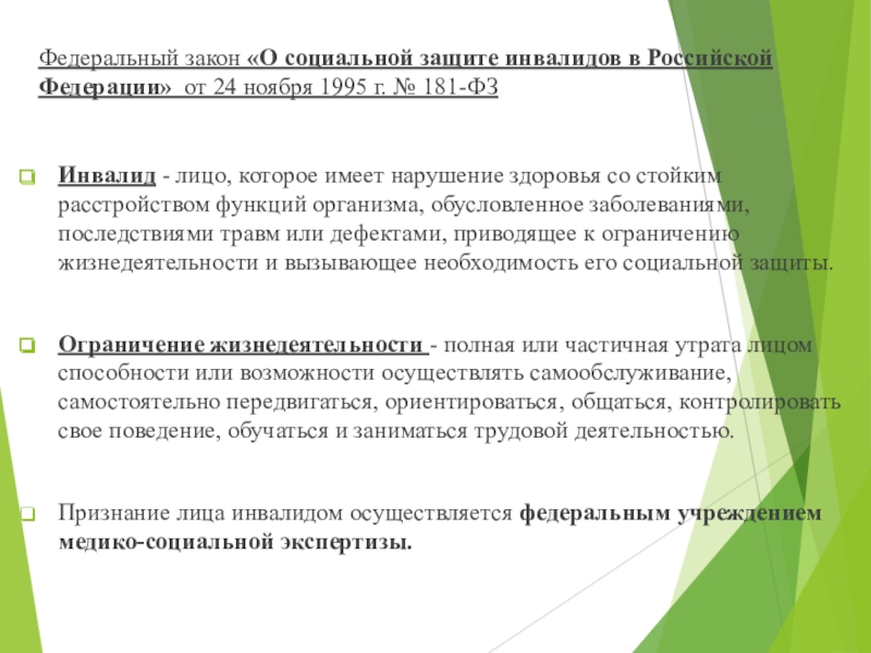 Слайд 24Федеральный закон «О социальной защите инвалидов в Российской Федерации» от 24