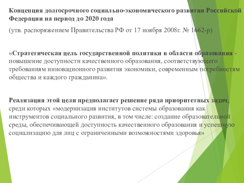 Реализация этой цели предполагает решение ряда приоритетных задач, среди которых «модернизация институтов системы образования как инструментов социального развития, в том числе: создание образовательной среды, обеспечивающей доступность качественного образования и успешную социализацию для лиц с ограниченными возможностями здоровья»