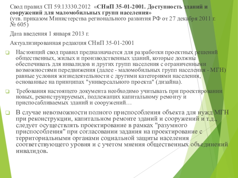 Слайд 18Свод правил СП 59.13330.2012 «СНиП 35-01-2001. Доступность зданий и сооружений для