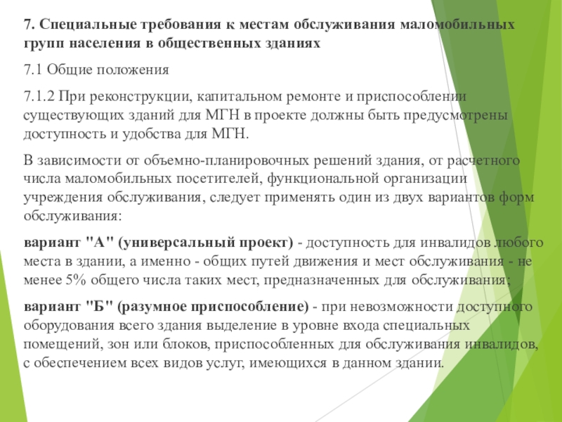 7.1.2 При реконструкции, капитальном ремонте и приспособлении существующих зданий для МГН в проекте должны быть предусмотрены доступность и удобства для МГН.