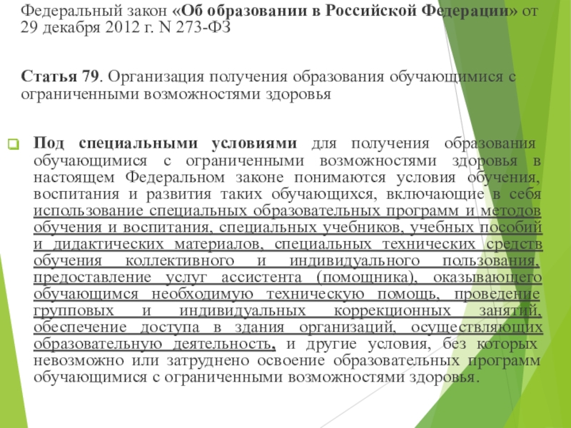 Под специальными условиями для получения образования обучающимися с ограниченными возможностями здоровья в настоящем Федеральном законе понимаются условия обучения, воспитания и развития таких обучающихся, включающие в себя использование специальных образовательных программ и методов обучения и воспитания, специальных учебников, учебных пособий и дидактических материалов, специальных технических средств обучения коллективного и индивидуального пользования, предоставление услуг ассистента (помощника), оказывающего обучающимся необходимую техническую помощь, проведение групповых и индивидуальных коррекционных занятий, обеспечение доступа в здания организаций, осуществляющих образовательную деятельность, и другие условия, без которых невозможно или затруднено освоение образовательных программ обучающимися с ограниченными возможностями здоровья.