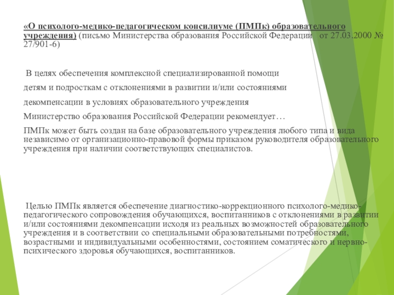 Слайд 23«О психолого-медико-педагогическом консилиуме (ПМПк) образовательного учреждения) (письмо Министерства образования Российской Федерации