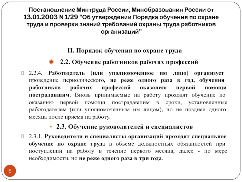 2.2.4. Работодатель (или уполномоченное им лицо) организует проведение периодического, не реже одного раза в год, обучения работников рабочих профессий оказанию первой помощи пострадавшим. Вновь принимаемые на работу проходят обучение по оказанию первой помощи пострадавшим в сроки, установленные работодателем (или уполномоченным им лицом), но не позднее одного месяца после приема на работу.