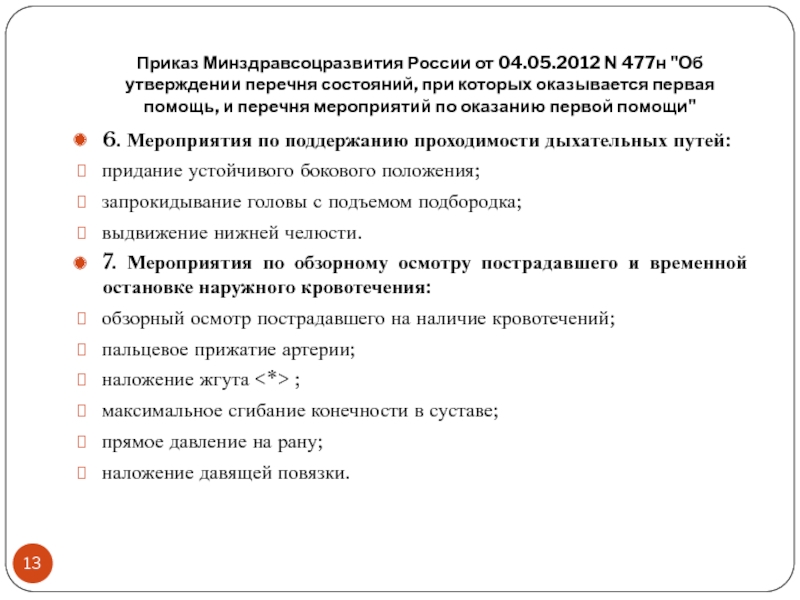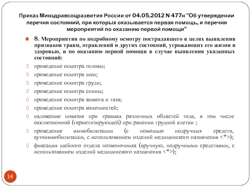 8. Мероприятия по подробному осмотру пострадавшего в целях выявления признаков травм, отравлений и других состояний, угрожающих его жизни и здоровью, и по оказанию первой помощи в случае выявления указанных состояний: