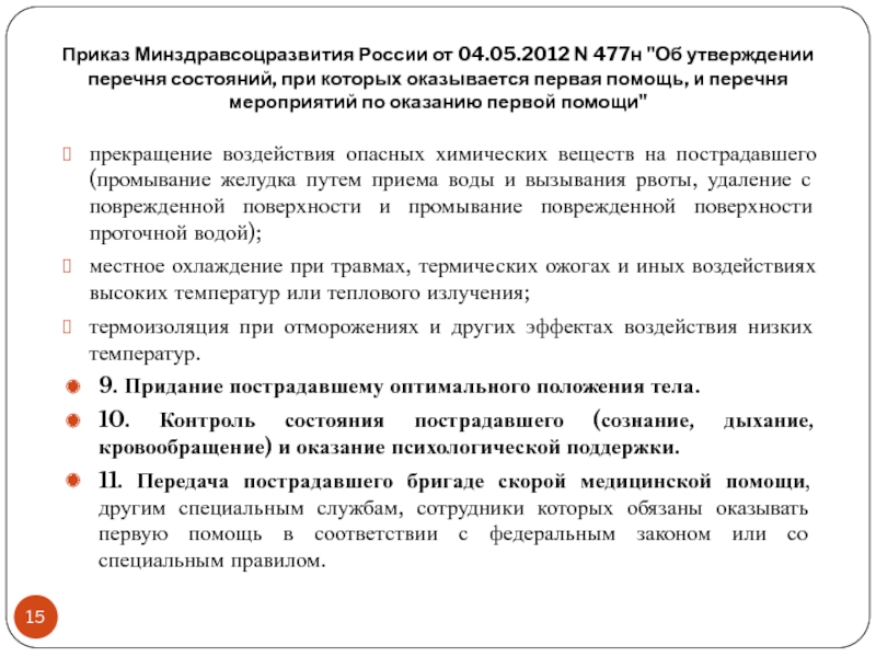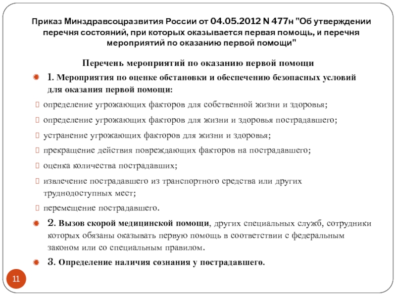 11. Передача пострадавшего бригаде скорой медицинской помощи, другим специальным службам, сотрудники которых обязаны оказывать первую помощь в соответствии с федеральным законом или со специальным правилом.