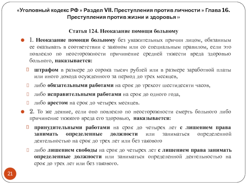 1. Неоказание помощи больному без уважительных причин лицом, обязанным ее оказывать в соответствии с законом или со специальным правилом, если это повлекло по неосторожности причинение средней тяжести вреда здоровью больного, наказывается: