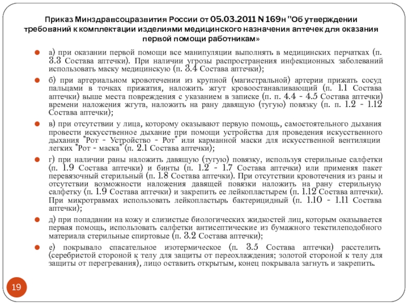 а) при оказании первой помощи все манипуляции выполнять в медицинских перчатках (п. 3.3 Состава аптечки). При наличии угрозы распространения инфекционных заболеваний использовать маску медицинскую (п. 3.4 Состава аптечки);