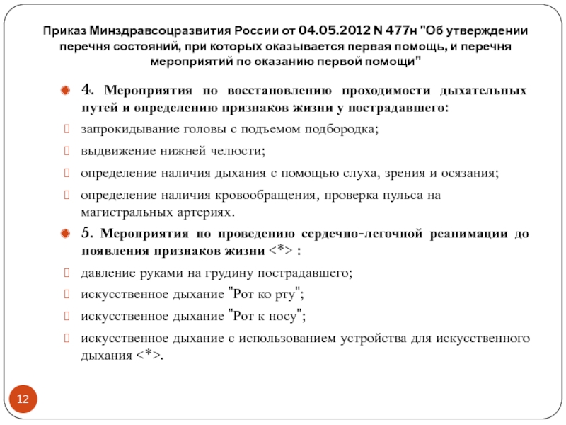 4. Мероприятия по восстановлению проходимости дыхательных путей и определению признаков жизни у пострадавшего: