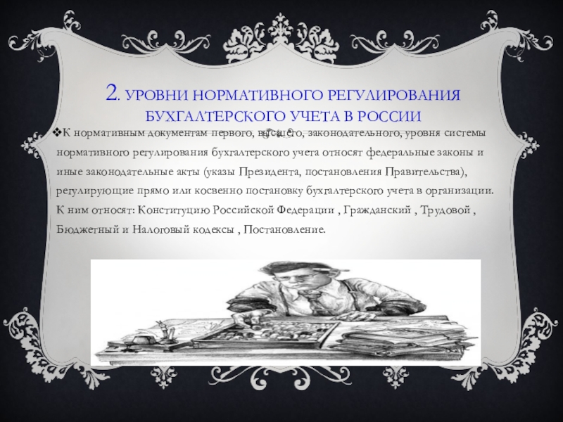 высшего, законодательного, уровня системы нормативного регулирования бухгалтерского учета относят федеральные законы и иные законодательные акты (указы Президента, постановления Правительства), регулирующие прямо или косвенно постановку бухгалтерского учета в организации. К ним относят: Конституцию Российской Федерации , Гражданский , Трудовой , Бюджетный и Налоговый кодексы , Постановление.