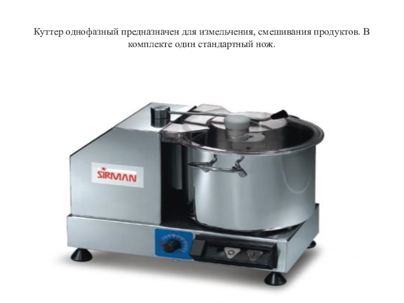 Слайд 83Куттер однофазный предназначен для измельчения, смешивания продуктов. В комплекте один стандартный