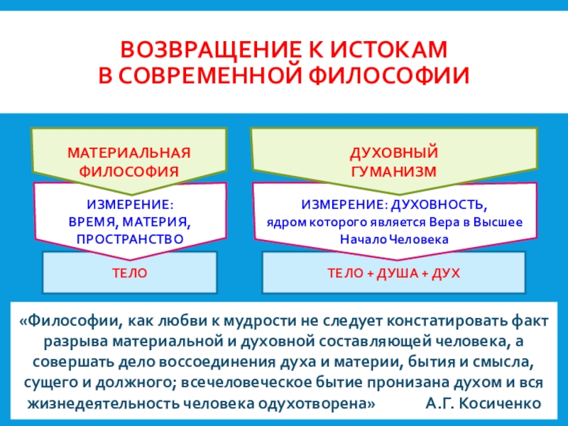 «Философии, как любви к мудрости не следует констатировать факт разрыва материальной и духовной составляющей человека, а совершать дело воссоединения духа и материи, бытия и смысла, сущего и должного; всечеловеческое бытие пронизана духом и вся жизнедеятельность человека одухотворена» А.Г. Косиченко
