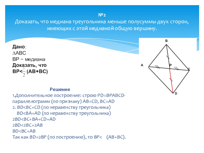Доказать, что медиана треугольника меньше полусуммы двух сторон, имеющих с этой медианой общую вершину.