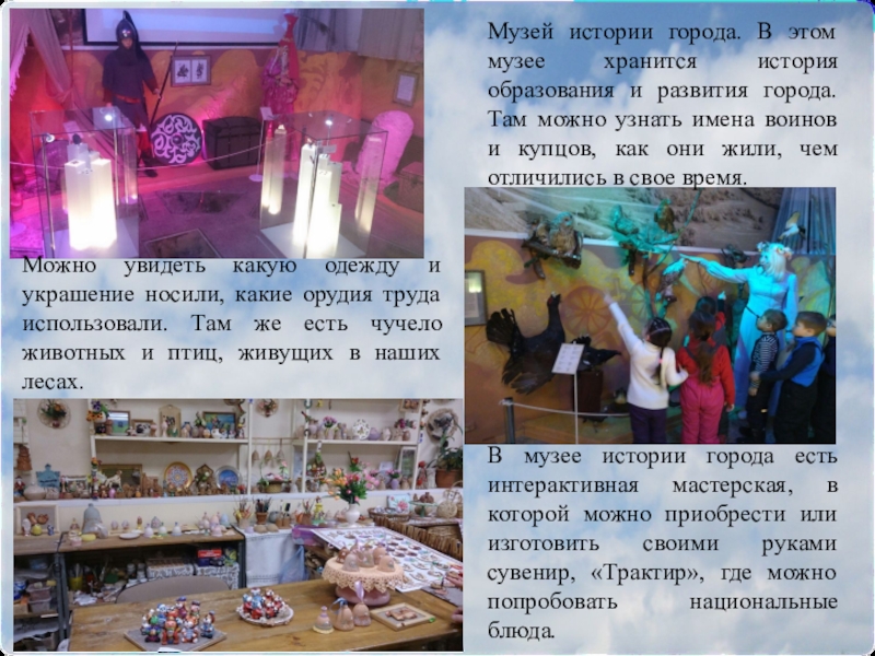 В музее истории города есть интерактивная мастерская, в которой можно приобрести или изготовить своими руками сувенир, «Трактир», где можно попробовать национальные блюда.