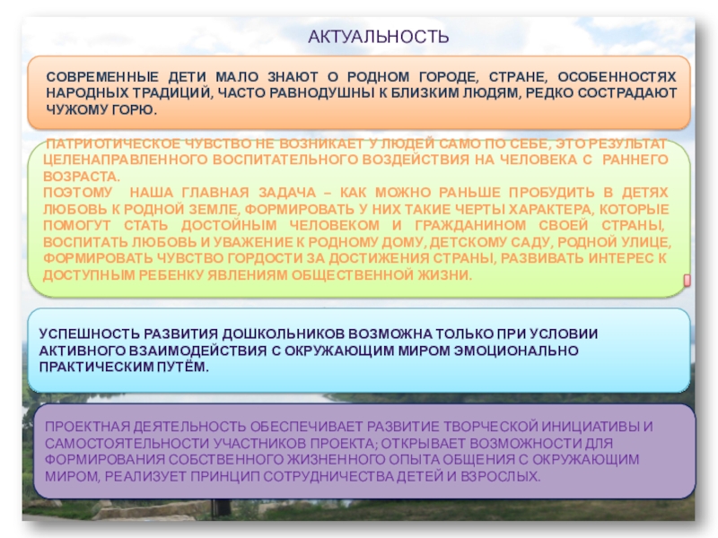Актуальность проблемы заключается в том, что современные дети мало знают о родном городе, стране, особенностях народных традиций, часто равнодушны к близким людям, редко сострадают чужому горю.